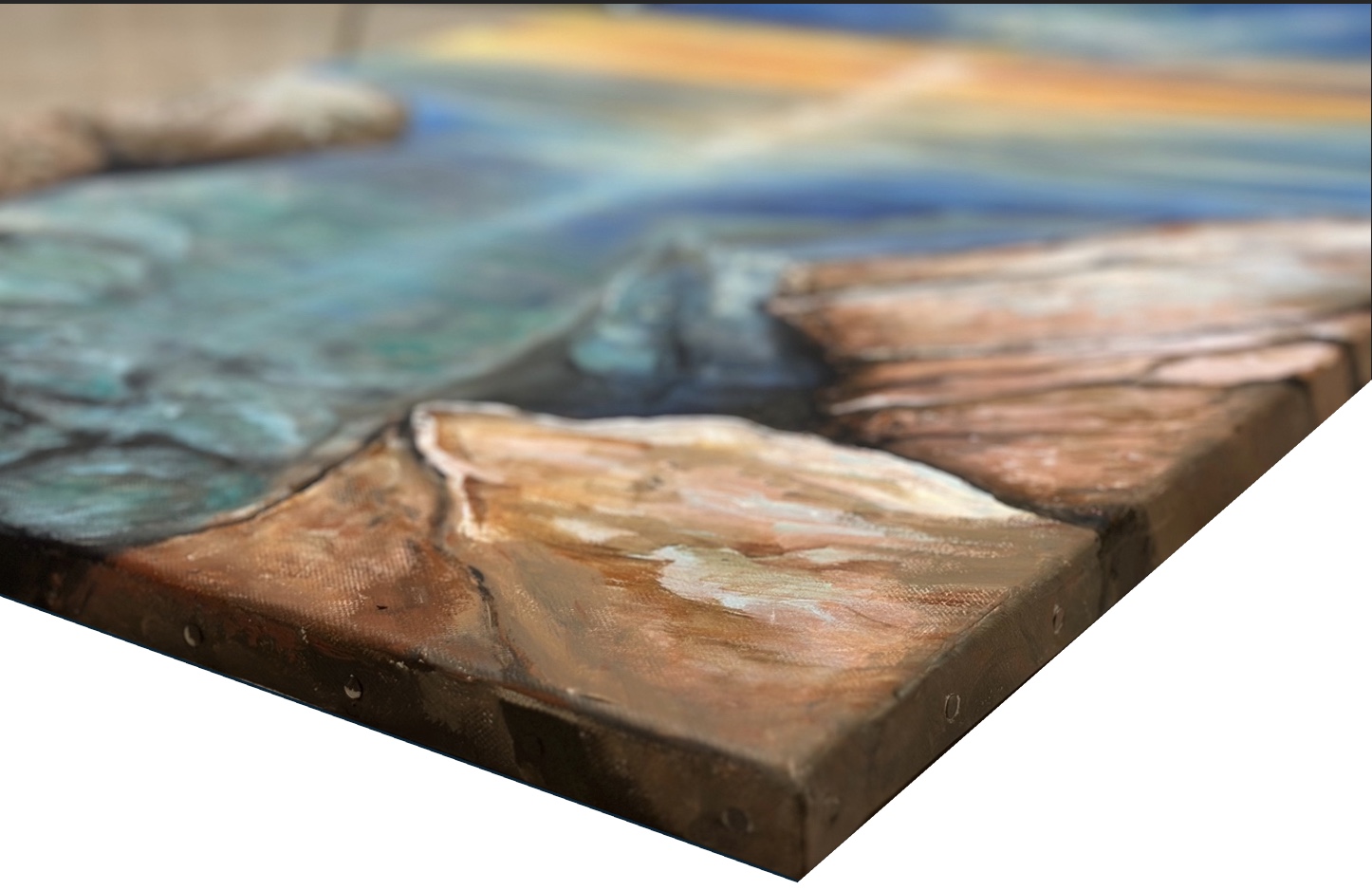 Peinture à l’acrylique sur toile. Plongez dans la lumière d’un soleil levant et le mouvement apaisant de l’eau.
